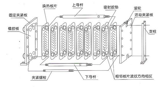 可拆卸板式换热器是由许多冲压有波纹薄板按一定间隔,四周通过垫片密封,并用框架和压紧螺旋重叠压紧而成,板片和垫片的四个角孔形成了流体的分配管和汇集管,同时又合理地将冷热流体分开,使其分别在每块板片两侧的流道中流动,通过板片进行热交换。