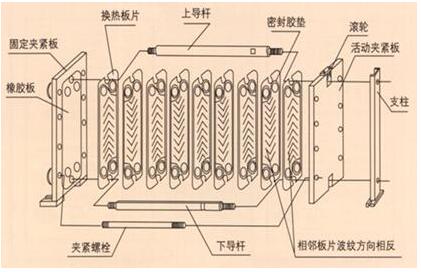 钛板片的周边及角孔处用橡胶垫片加以密封,框架由固定压紧板、勾当压紧板、上下导杆和夹紧螺栓等构成,钛板式换热器是将钛板片以叠加的情势装在固定压紧板、勾当压紧板中间,然后用夹紧螺栓夹紧而成。